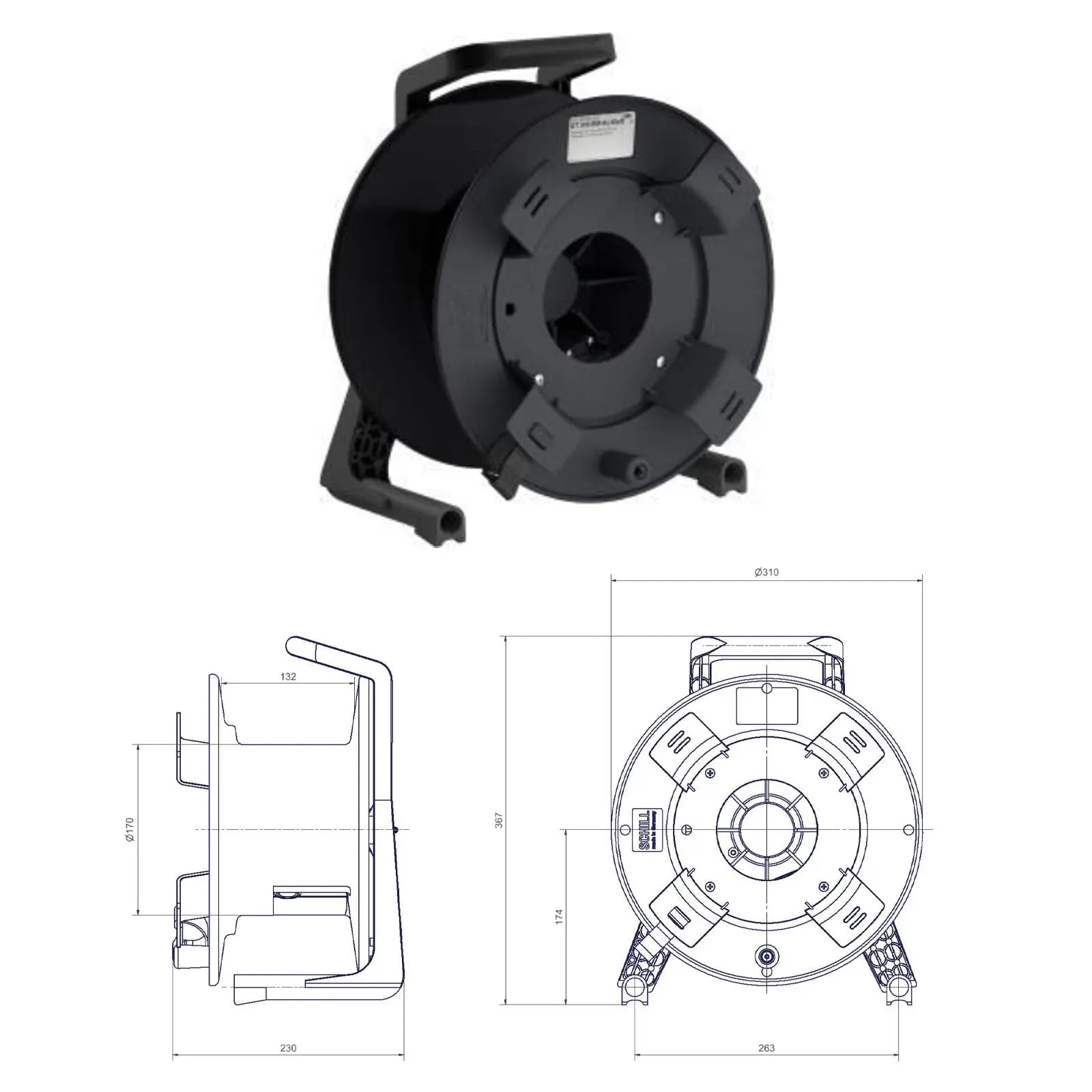 Rugged cable reels often classed as the industry standard within the sound lighting and events sectors. Manufactured in Germany using carefully selected materials to avoid breakages or failures onsite or in use. Being impervious to chemicals petrol and oil these cable reels are ideally suited to environments where such substances are prevalent. With an operating temperature of -20°C to +100°C and being weather-resistant these reels can cope with the most inhospitable conditions. The larger hole allows completed/terminated cable assembles to be wound on and fully-off with ease. When rewinding the cable connector can be fed through the hole wound and secured onto the RM flange ready for safe stowage or transport. 5 year warranty RM version features auxiliary spool to keep cable tails stored neatly Velcro strap to secure cable tail Break-proof PVC frame with locking drum brake PVC winding reel with unbreakable one-piece side flanges made of synthetic rubber Supplied without cable Max. capacity: 110m microphone cable (approx.) Drum: 310mmØ 43mmØ hole Weight: 1.78kg Manufacturers part number: GT 310.RM
