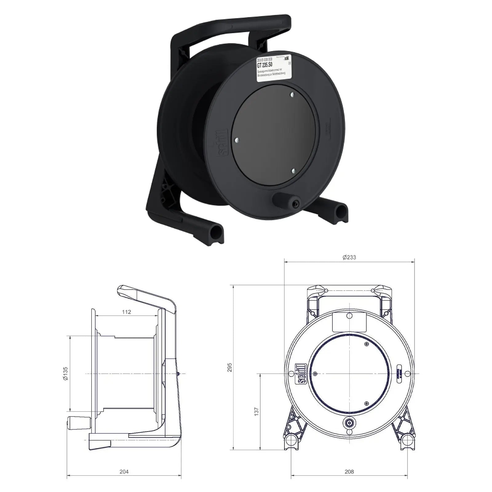Rugged cable reels often classed as the industry standard within the sound lighting and events sectors. Manufactured in Germany using carefully selected materials to avoid breakages or failures onsite or in use. Being impervious to chemicals petrol and oil these cable reels are ideally suited to environments where such substances are prevalent. With an operating temperature of -20°C to +100°C and being weather-resistant these reels can cope with the most inhospitable conditions. 5 year warranty Supplied with blank cover for self-tooling Break-proof PVC frame with locking drum brake PVC winding reel with unbreakable one-piece side flanges made of synthetic rubber Supplied without cable Max. capacity: 75m microphone cable (approx.) Drum: 235mmØ Weight: 1.01kg Manufacturers part number: GT 235.S0