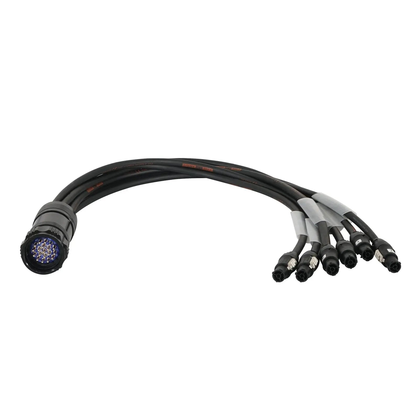 High quality rental-ready Socapex fan out cable made in Britain from Titanex H07RN-Fcable and Elumen8 Showsafe 19-Pin UL certified Socapex connectors. The cables are finished with a short length of clear heatshrink ready for identification or asset label and each tail is numbered to aid circuit identification. Made in Britain Titanex H07RN-F 2.5mm 3 Core rubber cable Elumen8 Showsafe 19-Pin connectors complete with 6-way cable gland 6 x Neutrik NAC3FX-W-TOP powerCON TRUE1 connectors Clear heatshrink suitable for identification or asset label Oil resistant and flame retardant according to IEC/EN 60332-1-2 standard Chemical resistant cross-linked elastomer insulation Bare copper conductors Operating temperature range: -25 to 55°C Maximum conductor temperature in service: 90°C Amphenol Socapex SL419 compatible IP67* ingress protection when mated (*Socapex end) FMLB (first make last break) earth contacts Multi-point gold plated contacts Individual tail length: 1m