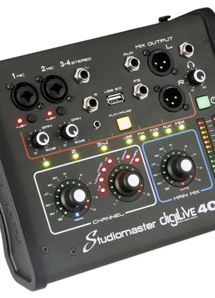 The DigiLive 4c is a compact digital mixer with 2 mic inputs and stereo line inputs.Ā Controlled via a tablet or phone over WiFi the DigiLive mixers make it easy to control levels from anywhere in the venue as well as store and recall presets for regular venues. Simple to use interface with 3 operation modes FULL BASIC LOCK (lock mode only allows fadermedia operation) 4 band parametric EQ HPF and intuitive operation SAVE EQ TO PRESETS (basic mode converts EQ to 4 band fixed) Analogue inspired buseffect routing Double tap the faders to get fast to zero EASY TO VIEW BUS ROUTING (you can even choose pre or post fade) High quality compression and gate dynamics Save presets to your library for easy recall BASIC MODE gives simple one control (easy to understand graphical display) Media player with simultaneous recording Play multiple formats from MP3 to WAV ONE TOUCH OPERATION TO PLAY (records LR main mix in stereo WAV) 31 band graphic on LR main mix outputs Easy to use and save to your library FULL CONTROL OVER YOUR MIX (double tap the control to centre the fader) DigiLive 4c Features: 4 input 2 Mic 1 Stereo Connect with any device with Wi-Fi or LAN PHONE TABLET LAPTOP multi platform 2 effect busses Assignable footswitch input Complete control from the front panel analogue feel to operate Balanced input and output sockets Ultra compact Professional features throughout