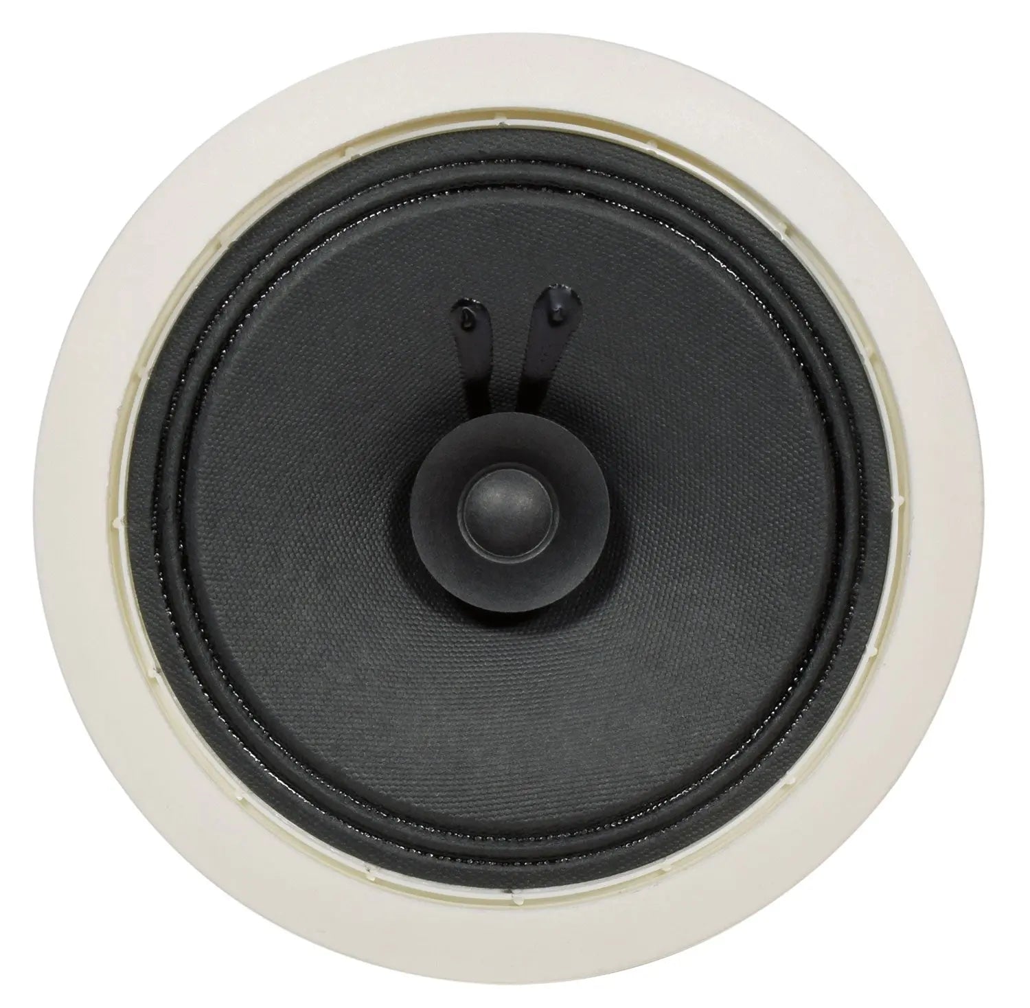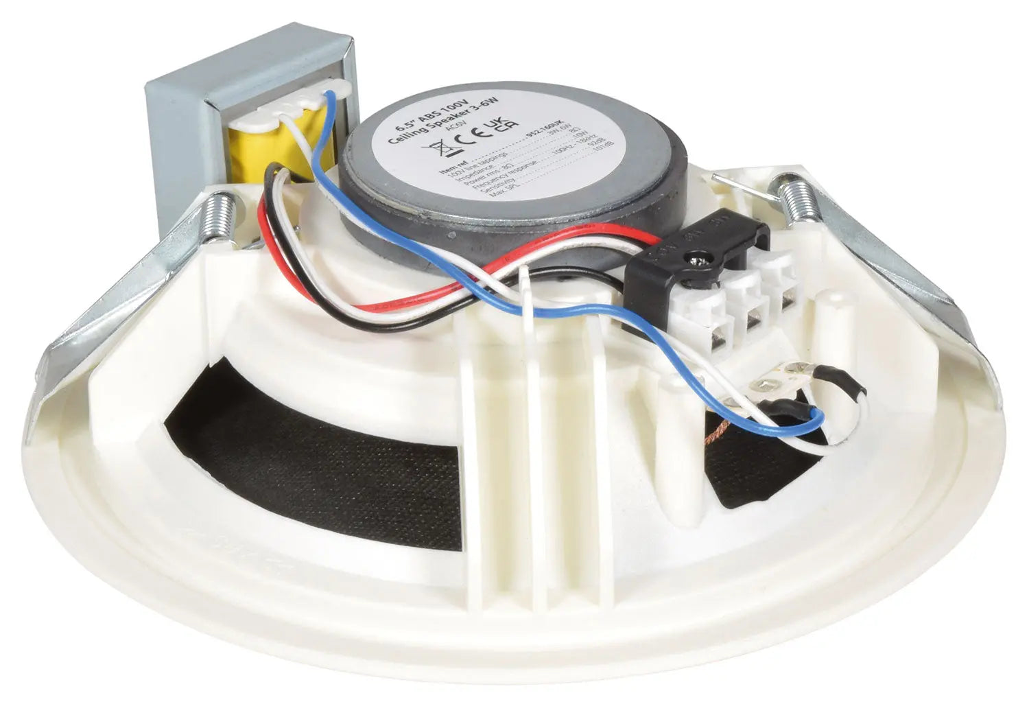 Flush-mount ceiling speaker with ABS frame and basket and powder coated steel grille, installed via an inbuilt pair of easy-fit spring clamps. Loaded with a 6.5" reinforced paper dual cone driver for full range sound reproduction. Operating at 100V line with 3W and 6W tappings. Designed for music and speech distribution in buildings with suspended ceilings.