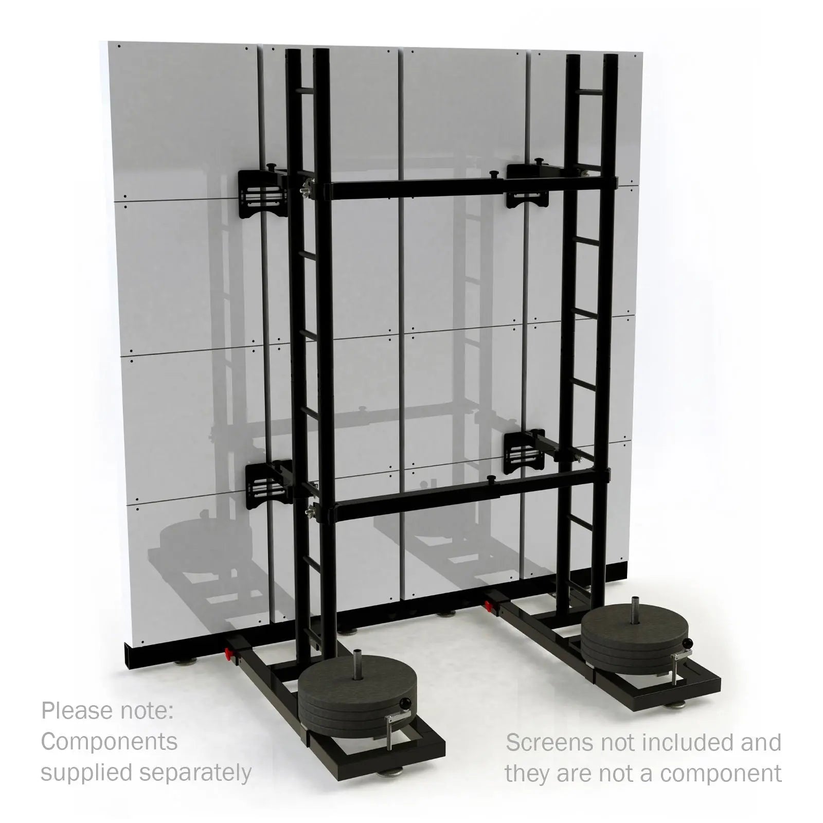 The VMB LED Wall Support (LWS) system comprises of a series of modular components to enable the simple design of LED wall supports using a minimum number of different parts. Ideal for permanent or temporary floor standing installations in exhibitions conferences presentations and museums. Working from the floor upwards the steel base is constructed from a front section (LW-B1) which has two height adjustable feet and rear section (LW-B2) which has an adjustable spindle to ensure accurate levelling. Additionally there are two conicals to attach the vertical sections which are available as 1.0m (LW-T1) 0.75m (LW-T0.75) and 0.5m (LW-T0.5) black aluminium ladders. With a simple conical connection these ladders are combined to achieve the desired height. The attachment of screens is simple using the boom arm fitted with a universal connection plate (LW-AR1). A range of accessories is available to extend the screen with further rows of panels. LW-U1 joins adjacent bases together so that the screen is a flat plane whereas the LW-UA5 allows the screen to be curved by 5 degrees. For extra stability the LW-AR2 is a telescopic reinforcement bar between stacks and the LW-AR3 is a fixed reinforcement bar. The LW-P1/LW-P2 is a counterweight/stage weight support which straddles the rear section of the base plate allowing a variable quantity of weights to suit the screen size. Modular component based system Black powder coated Robust metal construction Easy to assemble