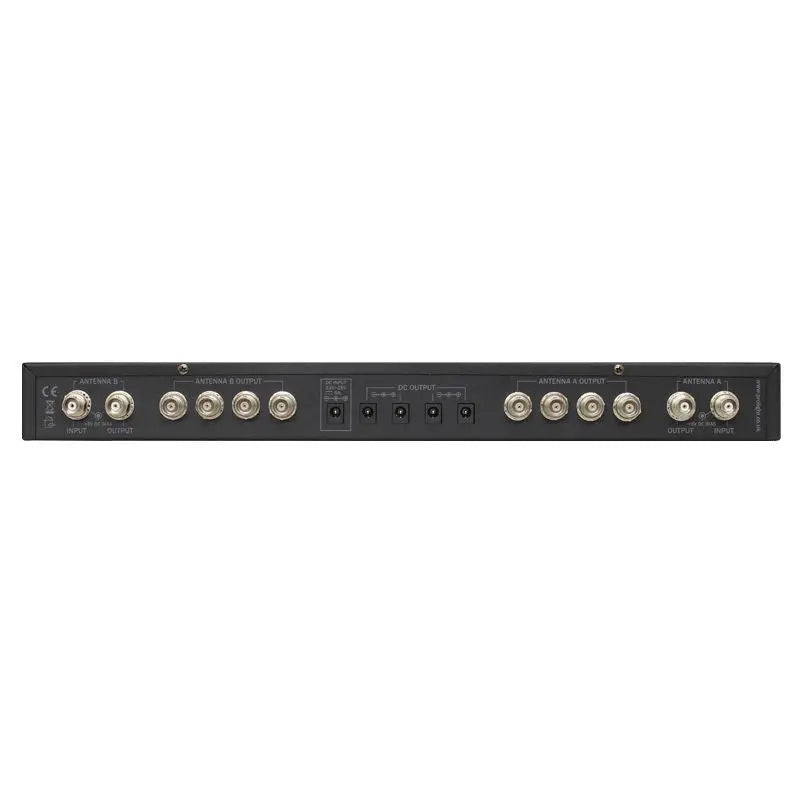 A UHF wideband antenna splitter suitable for use with up to four radio microphone receivers. Dual 1:4 configuration for use with up to four diversity receivers allows the use of two W Audio RPA2 active antennae across multiple receivers reducing intermodulation and resultant RF signal dropout. Loop thru function to allow system expansion Dual 1:4 configuration Wide band 400-1000Mhz operating frequency range DC power distribution BNC antenna connections 9V DC bias (100mA) output for use with active antenna On/off switch with LED power indication Supplied with 13A UK PSU (12V DC 5A) four 0.2m DC link cables ten 0.5m BNC cables and two 5.0m BNC cables