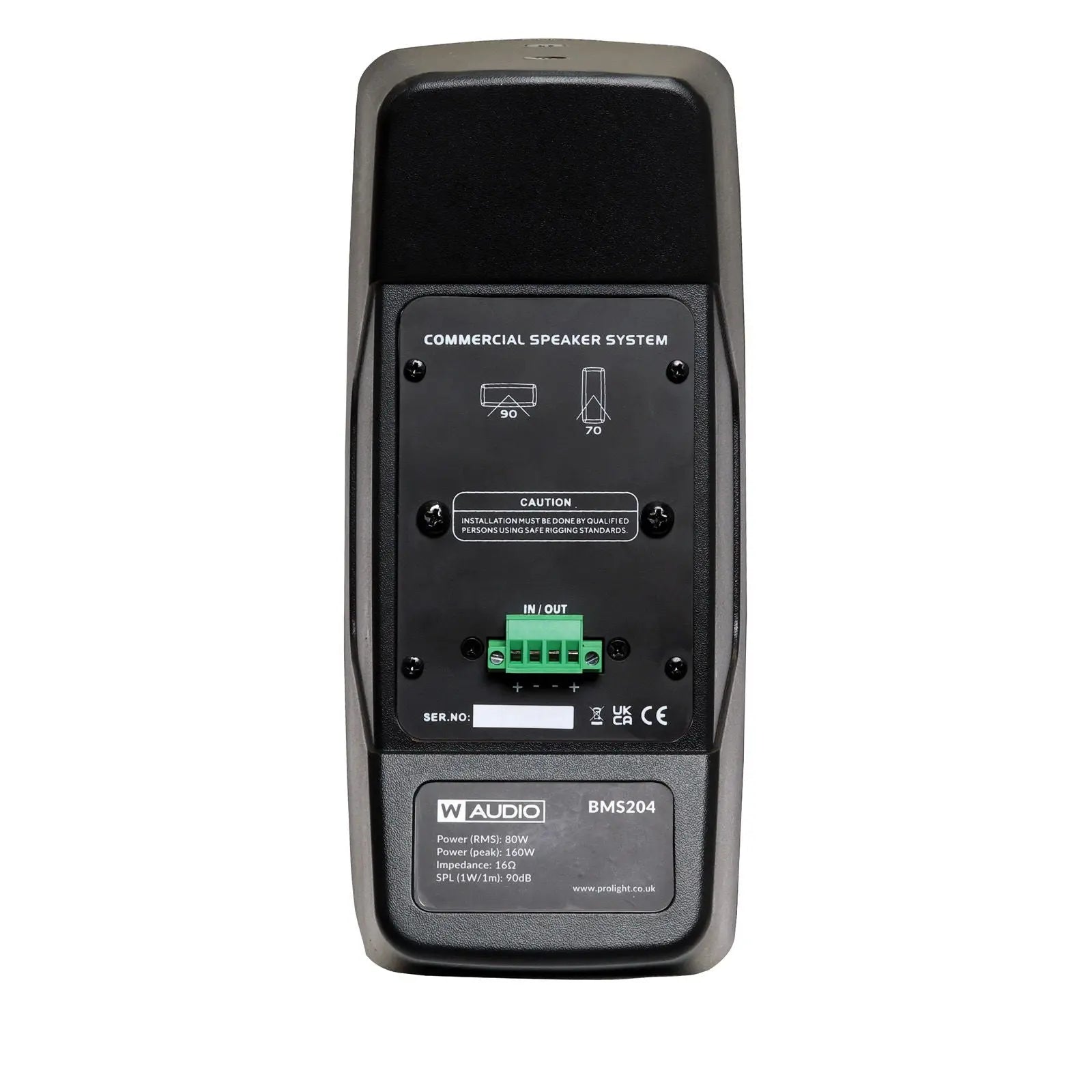 The W Audio BMS204 Series is a versatile speaker range designed for commercial audio installations available in both low impedance and 100V line versions. Featuring dual 4” mid/low-frequency drivers and a ¾” high-frequency horn these speakers deliver clear natural sound reproduction for both music and speech maintaining a flat frequency response.The 100V line models (SPEA100 SPEA101) offer multiple power taps (7.5W 15W 30W 60W) and a 16Ω low impedance option making them ideal for distributed audio systems. The low impedance models (SPEA102 SPEA103) provide 80W RMS power handling perfect for small venues restaurants and retail environments.Built with a robust ABS housing and available in black (SPEA100 SPEA102) or white (SPEA101 SPEA103) these compact and stylish speakers include a wall-mount bracket for easy installation in commercial and hospitality spaces. 2-way low impedance loudspeakers Supplied in single units Available in black or white Robust ABS housing Continuous power (RMS): 80W Peak power: 160W Max. calculated SPL: 112dB Sensitivity (1W/1m): 90dB Frequency range (-10dB): 85Hz - 20kHz Frequency range (-3dB): 100Hz - 20kHz Horizontal coverage: 70° Vertical coverage: 90° LF transducers: 2 x 4” HF transducers: 1 x 3/4” Nominal impedance: 16Ω Connections: Phoenix type plug-in terminals Mounting options: Includes wall mounting bracket