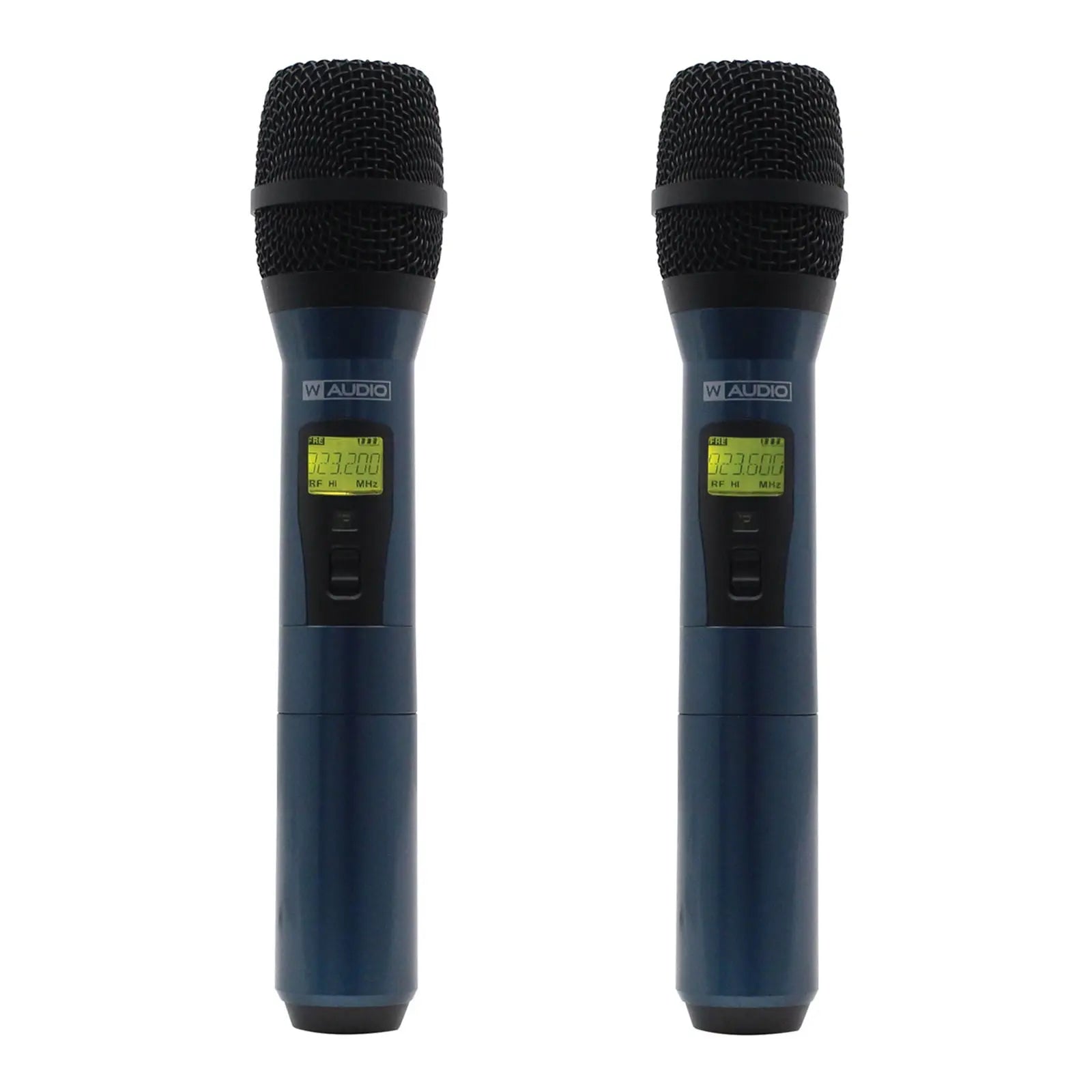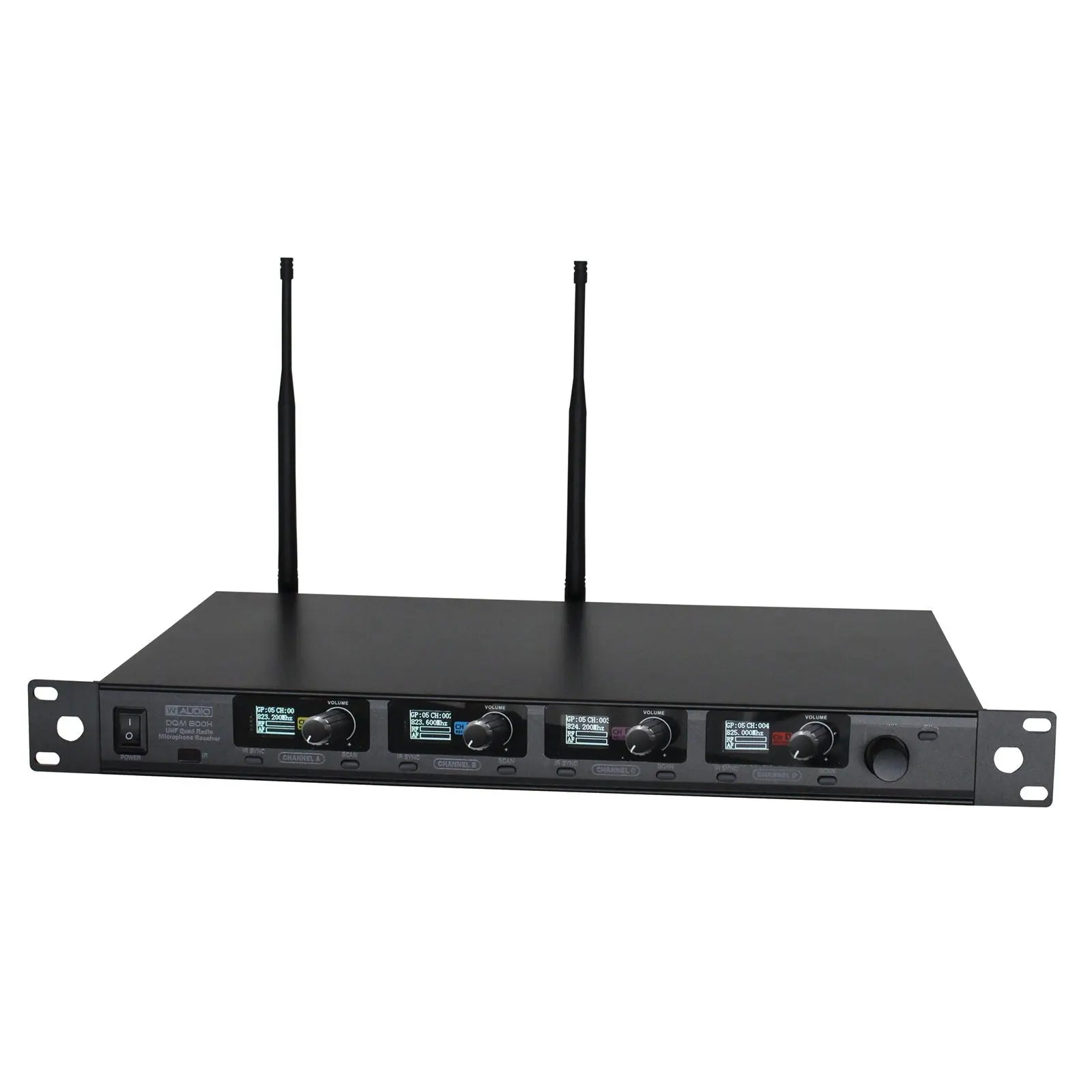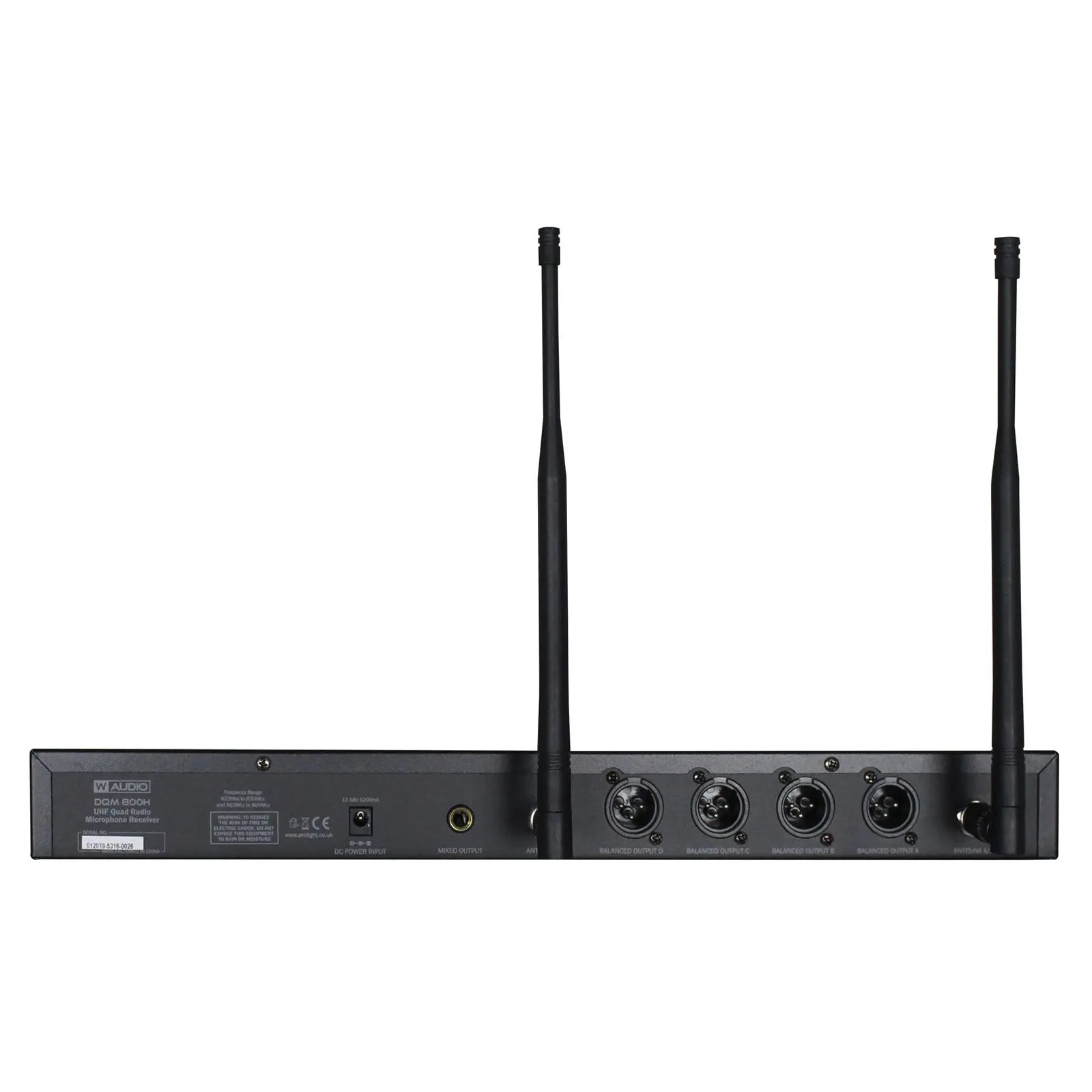 DQM series wireless microphones are quad UHF handheld systems designed for the professional user featuring a full width receiver for the ultimate in RF stability. They have a tuning bandwidth up to 9Mhz+2Mhz with 99 selectable frequencies on the 823-832Mhz CH65 and 863-865Mhz license-free CH70 bands. These systems offer crystal clear sound reproduction and rock-solid reliability along with outstanding vocal reproduction and stable wireless connectivity allowing freedom of movement on stage. Handheld transmitters feature ergonomic design with a rackmount housing to stand up to the rigours of the road. The flexibility of the handheld systems may be increased by purchasing the additional DQM belt pack kit. UHF band Phase Lock Loop (PLL) offering stable RF transmission Preset frequency groups plus a user definable frequency group allows users to tune the operating frequency of each channel OLED display offers a wide viewing angle while remaining bright in darkened conditions Frequency Channel RF and AF signal strength meters Combined use jog wheel button operation for fast menu navigation 1U rack metal housing with integrated brackets include antenna cable interface for front-mount antenna Integrated antenna splitter for reduced RF interference Balanced XLR output for each channel plus unbalanced mixed output Automatic frequency SCAN function IR infrared frequency synchronisation via infrared interface Mute circuitry for reduced noise Flat frequency response: 50Hz-16KHz Dynamic cardioid handheld microphone capsule 1U full width rack mount receiver Up to 8 DQM transmitters can be used simultaneously when configured manually (one 800mhz and one 600mhz)