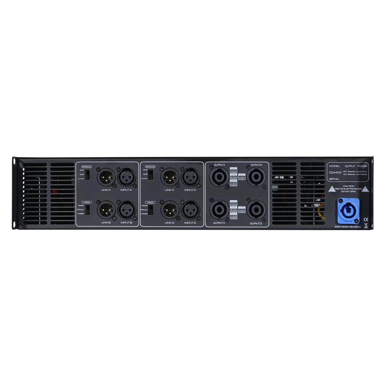 The CD series feature high output power outstanding sound quality and superior stability for a wide range of installed sound systems as well as portable live sound applications. Available in two and four channel versions and with an RMS wattage of up to 8000W this series feature class D technology in a compact 2U package. Automatic clip limiting along with high efficiency tunnel cooling and DC fans ensure reliability time after time. Power output @ 8Ω: 4 x 400Wrms Power output @ 4Ω: 4 x 700Wrms Power output bridge @ 8Ω: 2 x 1200Wrms Frequency response: 20Hz to 20kHz Input sensitivity: 0.775V 32dB or 26dB Damping factor: 250 Slew rate: 12V/uS Min. Load impedance (Stereo): 4Ω Min. Load impedance (Bridge): 8Ω Protection circuits: Soft start limit thermal short circuit overload DC fault protection and AC power supply fuse LED indicators: Active signal and clip Input connections: 4 x XLR sockets 1 x powerCON input Output connections: 4 x speakON connectors Additional features: Switchable stereo parallel and bridge