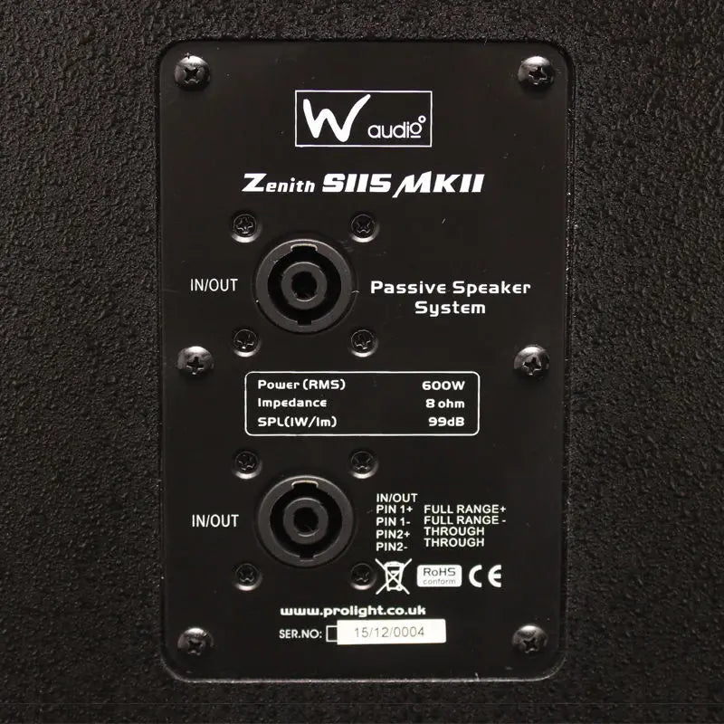 This premium passive enclosure with a single subwoofer is constructed from robust birch ply with a durable hard-wearing finish and features CNC machined pocket handles and a 35mm top hat for satellite mounting. This Zenith series cabinet features a die-cast aluminium chassis for increased rigidity helping deliver greater sonic accuracy. Please note: Shipping charges may apply Continuous power (RMS): 600W Peak power: 2400W Maximum calculated SPL: 132dB Sensitivity (1W/1m): 99dB Frequency range (-10dB): 40Hz - 220Hz Frequency range (-3dB): 45Hz - 220Hz LF transducer: 15" Nominal impedance: 8Ω Connections: 2 x speakON connectors Mounting options: 35mm top hat for satellite mounting and multiple 10mm rigging points Other features: Rear mounted castor fixing points