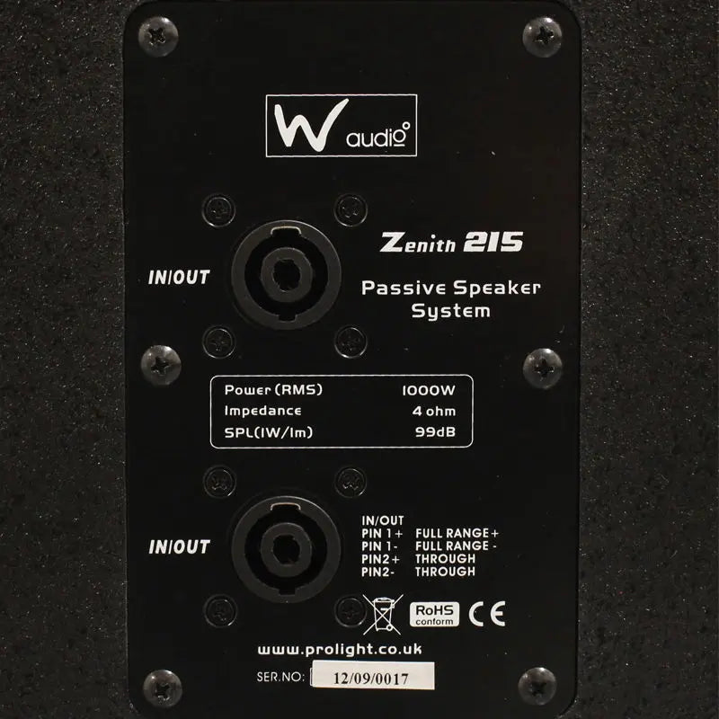 This premium passive enclosure with twin subwoofers is constructed from robust birch ply with a durable hard-wearing finish and feature CNC machined pocket handles and a 35mm top hat for satellite mounting. This Zenith series enclosure also features a die-cast aluminium chassis for increased rigidity helping deliver greater sonic accuracy. Please note: Shipping charges may apply Continuous power (RMS): 1000W Peak power: 4000W Maximum calculated SPL: 135dB Sensitivity (1W/1m): 99dB Frequency range (-10dB): 35Hz - 200Hz Frequency range (-3dB): 45Hz - 200Hz LF transducer: 2 x 15" Nominal impedance: 4Ω Connections: 2 x speakON connectors Mounting options: 35mm top hat for satellite mounting and multiple 10mm rigging points
