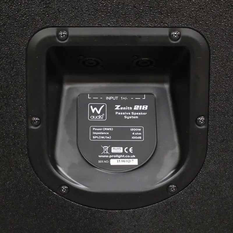 This premium passive enclosure with twin subwoofers is constructed from robust birch ply with a durable hard-wearing finish and feature CNC machined pocket handles and a 35mm top hat for satellite mounting. This Zenith series enclosure also features a die-cast aluminium chassis for increased rigidity helping deliver greater sonic accuracy. Please note: Shipping charges may apply Continuous power (RMS): 1200W Peak power: 4800W Maximum calculated SPL: 137dB Sensitivity (1W/1m): 99dB Frequency range (-10dB): 32Hz - 200Hz Frequency range (-3dB): 40Hz - 200Hz LF transducer: 2 x 18" Nominal impedance: 4Ω Connections: 2 x speakON connectors Mounting options: 35mm top hat for satellite mounting and multiple 10mm rigging points Other features: Two wheel board catch plates rear mounted castor fixing points and recessed speakON connector plate